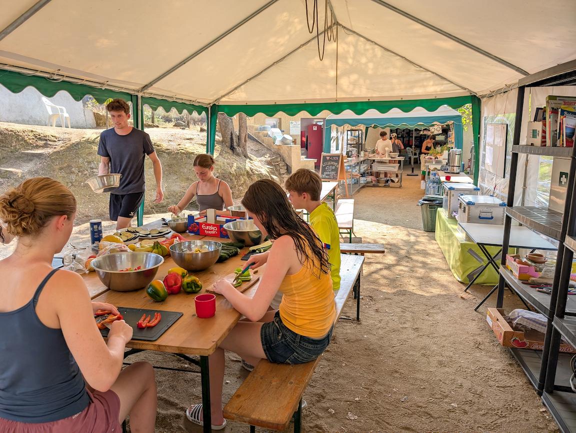 Die Campküche ist ein Ort, an dem Vieles zusammentrifft: der Duft von frischen Zutaten, helfende Hände, Gespräche über den Tag und das Vorfreuen auf das gemeinsame Essen. Jede Familie bringt sich ein: mal beim Schneiden, mal beim Abwasch, mal einfach nur beim Decken eines Tisches unter freiem Himmel. Abends sitzt man zusammen, teilt Erlebnisse, lacht viel und genießt das Gefühl von Gemeinschaft. Der freie Tag in der Woche lädt zusätzlich ein, Korsika auf eigene Faust zu entdecken – ein Marktbesuch, ein Dorf in den Bergen oder einfach ein Tag am Meer. Dieser Urlaub schafft eine Balance aus Aktivität und Ruhe, Abenteuer und Entspannung – und hinterlässt Erinnerungen, die lange bleiben.
