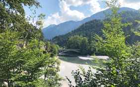 Die heutige Strecke von rund 25 Kilometern bringt euch an besondere Orte. Gleich zu Beginn steht der markante Lechzopf am Fluss, bevor die Hängebrücke euch über das Wasser führt, ein Moment, der Bewegung und Perspektive verbindet. Ein stiller Baggersee mit Picknickplätzen bietet Raum zum Verschnaufen, umgeben von der frischen Bergluft. Anschließend überschreitet ihr die Grenze nach Bayern und nähert euch dem Lechfall. Das rauschende Wasser zeigt hier die Kraft des Flusses und markiert den Übergang in eine sanftere Landschaft. Vor dem berühmten Lechfall wartet ein Baumkronenweg mit herrlichen Ausblicken, ehe ihr in Füssen mit seinem historischen Flair empfangen werden. Übernachtung und Frühstück in einem 3-Sterne-Sterne-Hotel.