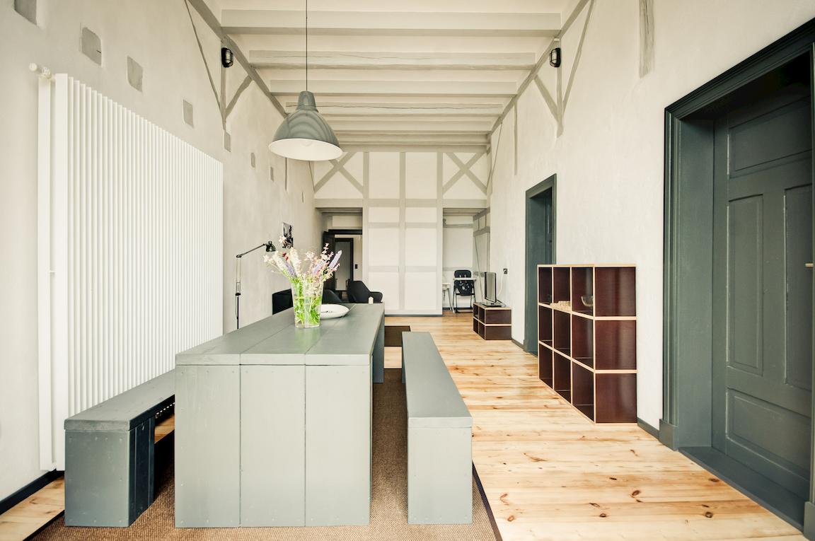 Charakteristisch für Middenmank ist seine identitätswahrende und zugleich moderne Architektur. In jedem Raum spüren Sie die Vergangenheit und genießen dennoch allen Komfort der Gegenwart. Die sieben eleganten Wohnungen für vier bis acht Personen haben je eine Terrasse oder einen Außensitzplatz, sind hell und geräumig sowie mit designorientierten Küchen und Bädern ausgestattet. Als kleine Liebeserklärung an ihre Heimat haben Britta und Andy sie auf Namen wie „Boen“, „Waschhus“ oder „Stuv“ getauft. Die Dielenwohnung „Däl“ mit ihrer Fachwerkwand war einst Dreh- und Angelpunkt des Hofes. Früher fuhren durch das große Tor die Erntewagen ein und aus – heute scheint die Sonne durch das nun verglaste Tor, hinein in die geräumige Wohnung, in der bis zu zwei Familien schöne Ferien verbringen. Mit fast 100 m² sogar noch großzügiger ist das „Waschhus“, ein freistehendes Ferienhaus mit zwei Etagen und eigener Terrasse.