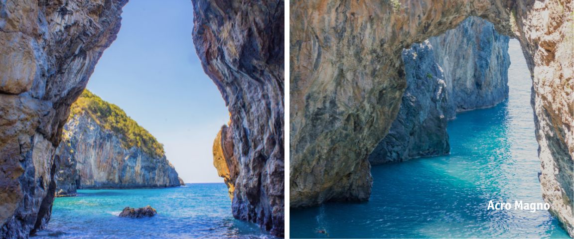 Der Arcomagno ist eine kleine, geschützte Badebucht, vom Meer aus verborgen hinter einem natürlichen Steinbogen. Der Zugang ist nicht ganz einfach, aber gut planbar: Am sichersten und familienfreundlichsten ist der Weg über das Wasser. Wer möchte, mietet in der Nähe ein Tretboot und fährt durch den Bogen in die geschützte Bucht hinein. Der Zugang zu Fuß führt über einen schmalen Pfad, der teils steil und felsig ist. Mit älteren, trittsicheren Kindern ist der Weg zum Arco Magno aber gut machbar, wenn gutes Schuhwerk, freie Hände und Vorsicht mit dabei sind.