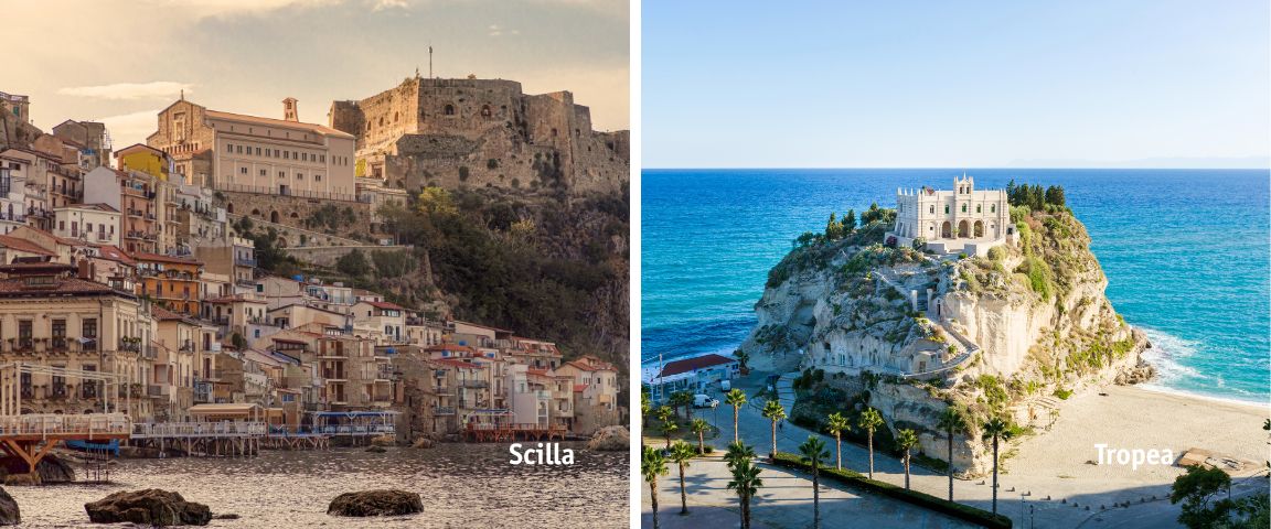 Scilla liegt am Tyrrhenischen Meer und ist heute besonders bekannt für das historische Fischerviertel Chianalea, wo die Häuser direkt über dem Meer gebaut sind. Über dem Ort erhebt sich das Castello Ruffo – mit weitem Blick über die Meerenge von Messina und bei gutem Wetter bis zum Vulkan Ätna auf Sizilien.