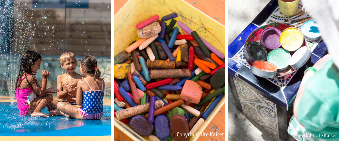 Vier Kinder essen fleißig Äpfel, eines weint auf meinem Arm. Der Zeitpunkt ist gekommen, ich ziehe einen der rettenden Notfall-Luftballons aus meiner Hosentasche. Puste ihn auf. Fünf Augenpaare beobachten mich dabei aufmerksam, mein etwas theatralisch angestrengtes Gesicht, den leuchtend roten Ballon, der sich nach und nach mit Luft füllt. „Luftballon haben?“, fragt Emil schnell und erhebt sich. „Ich auch“, ruft Marlene, erwartungsvoll stehen beide vor mir. „Mal sehen! Wir machen damit ein Spiel, alle zusammen“, erkläre ich ihnen. „Schaut mal, Achtung, ich lasse den jetzt gleich fliegen... eins... zwei... und...... – drei!“, mit einem laut flatternden Pupsgeräusch saust er in hohem Bogen davon. Die Kinder halten den Atem an, ihre faszinierten Blicke versuchen dem Ballon zu folgen, und als er dann unter dem nächsten Busch landet ist die Begeisterung groß. „Ist gefloooogen!“, ruft Linus lachend und mit leuchtenden Augen. Marlene und Emil rennen den Luftballon holen.